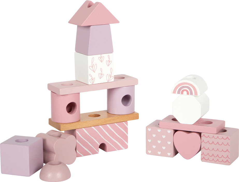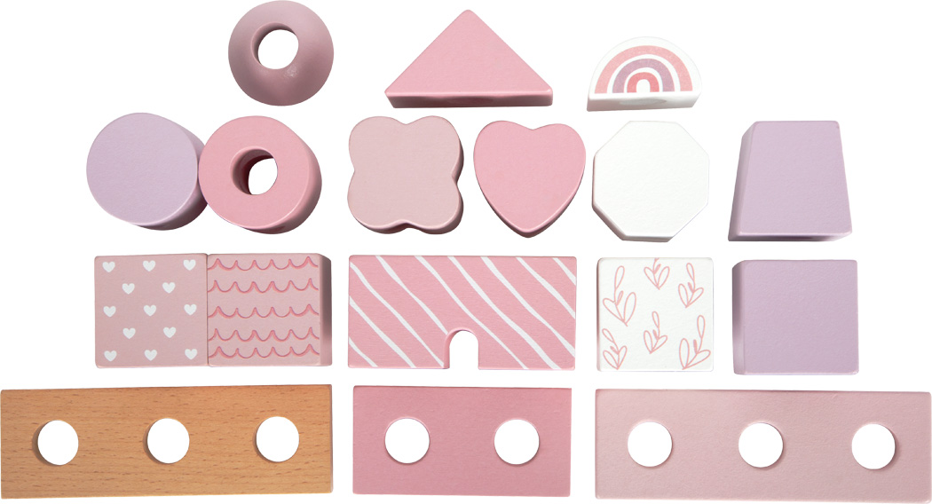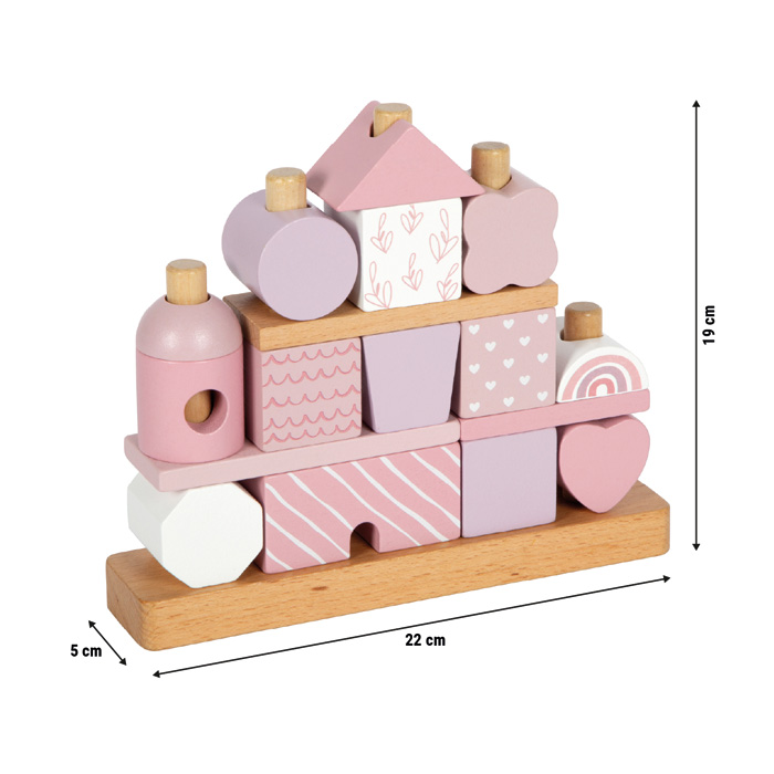Dieses Stapelhaus ist viel mehr als nur ein klassisches Steckspiel. Mit seinen liebevoll gestalteten Bausteinen in verschiedenen Formen, Mustern und sanften Rosatönen lädt es kleine Baumeister dazu ein, immer wieder neue Architektur-Meisterwerke zu erschaffen.