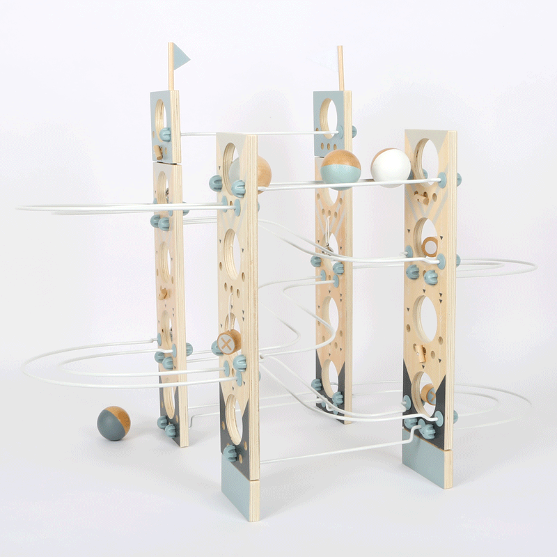 Modulare Kugelbahn aus Holz – Kreativer Bauspaß in Rauchblau