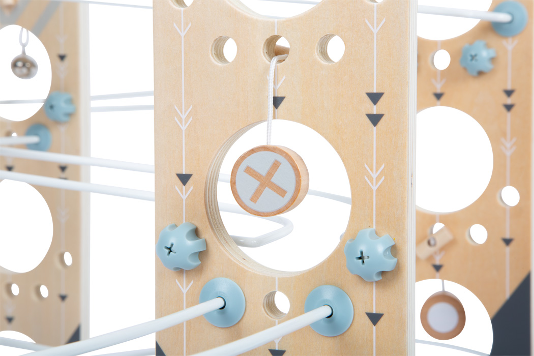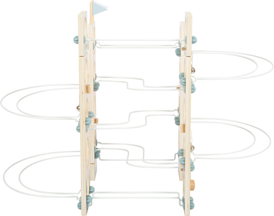 - Sensorische Highlights: Integrierte Glöckchen sorgen für akustische Erfolgserlebnisse, wenn die Kugel vorbeisaust, während bunte Fahnen Start und Ziel markieren.